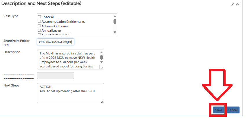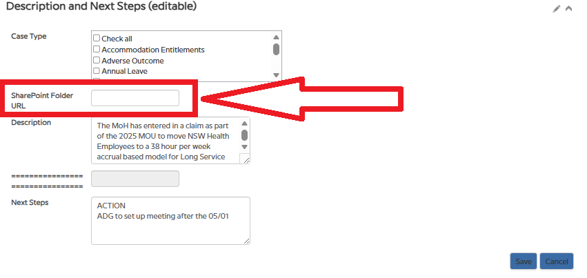 - Once saved, the SharePoint folder is now linked to the case.