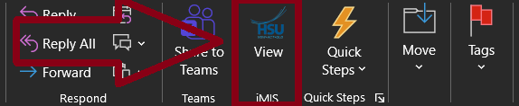 - Ensure the Save to iMIS plug-in is visible in the Outlook toolbar, this will display as the HSU logo with "view" under it.